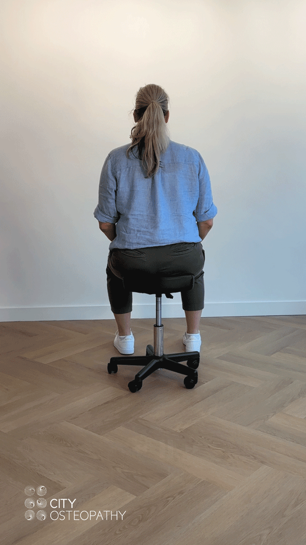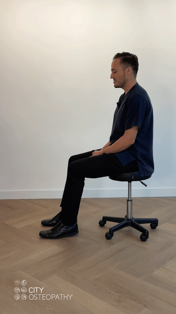 Sit taller and gently lift your chest while drawing shoulder blades down and back. This opens compressed chest muscles and activates postural stabilisers.