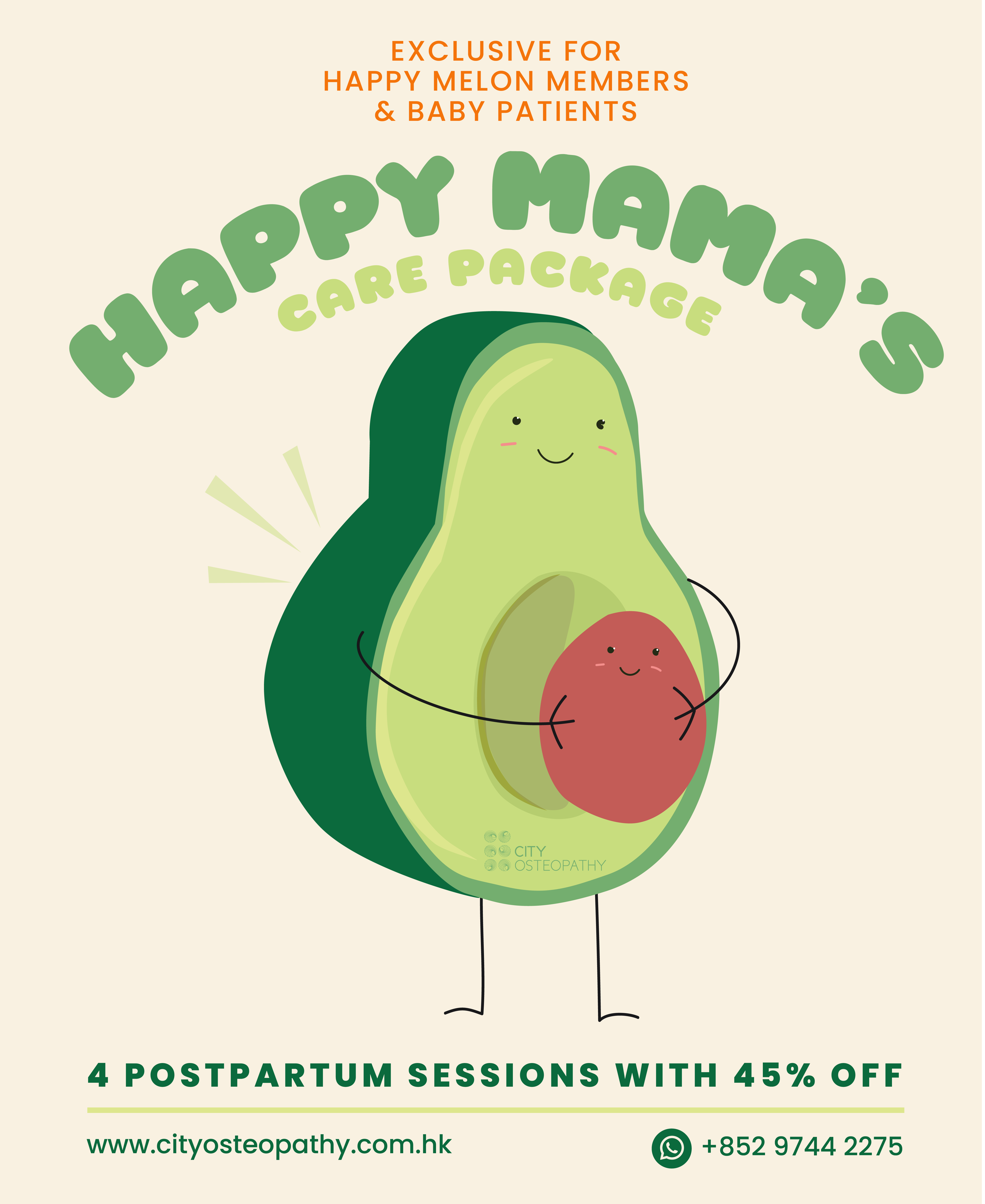 If your baby is currently enrolled in our Happy Melons Program or in our care, you may be eligible for our Happy Mamas Care Package of 4 postpartum osteopathy sessions for 45% off.